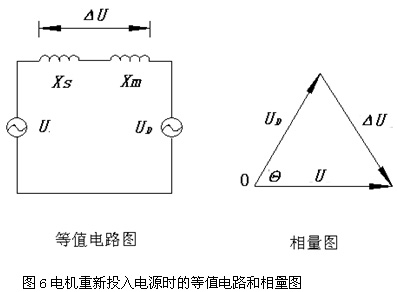 從圖4和圖5中可以看出,瞬間斷開(kāi)電源后,電機感應電壓有所衰減,同時(shí)感應電壓與工頻電源電壓的相位已開(kāi)始拉開(kāi),不同時(shí)刻投入工頻電源,將會(huì )產(chǎn)生不同的△U。圖6是電機重新投入電源時(shí)的等值電路和相量圖。