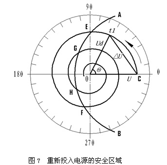 H點(diǎn)以后三個(gè)安全投入工頻電源的時(shí)間范圍,都是由相位和幅值共同作用的結果。我們也還可以分別從相位和幅值兩個(gè)方面入手來(lái)尋求解決辦法。