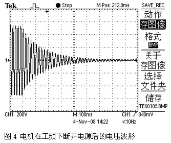 由于變頻器輸出的是PWM波,其相位不易觀(guān)察,測得在工頻狀態(tài)下的電壓波形進(jìn)行進(jìn)一步的分析。因為變頻器50Hz時(shí)的輸出電壓與工頻電壓作用在電機上基本時(shí)等效的,并不影響分析結果。圖4是一2.2KW電機在工頻電源下突然斷開(kāi)電源后的電壓波形圖,由該圖可以看出,電壓波形沒(méi)有跳變,所以斷開(kāi)瞬間感應電動(dòng)勢與電源電壓是同相位的,其幅值也是基本相等的。隨著(zhù)剩磁的慢慢消失,電壓幅值逐漸降低,同時(shí)伴隨著(zhù)轉速的降低感應電動(dòng)勢的頻率逐漸下降,其相位也逐漸與電源相位拉開(kāi)。頻率越低,單位時(shí)間內拉開(kāi)的相位差也就越大。