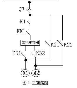根據用戶(hù)要求,現場(chǎng)共兩套系統,配置兩臺風(fēng)機,配置一套變頻器,即一臺變頻器拖動(dòng)二臺電機,采用一拖二方式。旁路系統由1個(gè)高壓真空接觸器KM1和5個(gè)高壓隔離開(kāi)關(guān)K1、K21、K22、K31、K32組成。要求K21不能和K1、K31同時(shí)閉合,K22不能和K1、K32同時(shí)閉合,在電氣上實(shí)現互鎖。K1與K31閉合,K21斷開(kāi),1#電機變頻運行;K1與K32閉合,K22斷開(kāi),2#電機變頻運行。K1與K31斷開(kāi),K21閉合,1#電機工頻運行;K1與K32斷開(kāi),K22閉合,2#電機工頻運行。