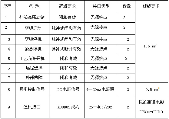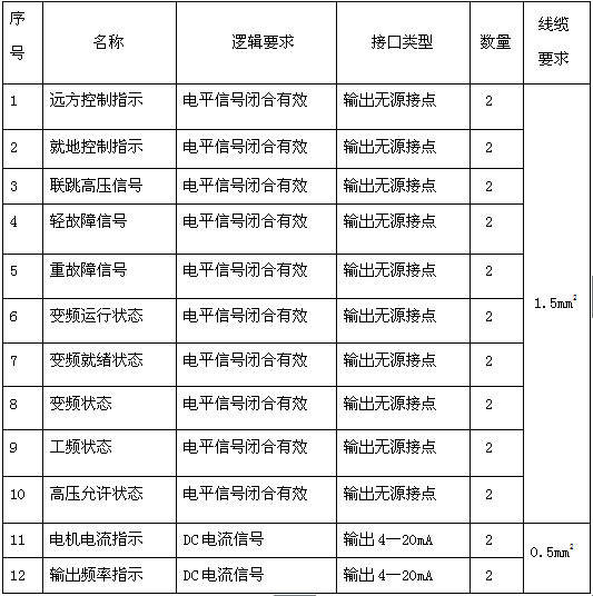 ?。?)外部高壓就緒,故障輸出,報警輸出,就地指示,遠程指示,變頻指示,工頻指示,遠程急停,遠程開(kāi)機,遠程停機,遠程頻率給定,電流輸出,頻率輸出,工藝允許,聯(lián)跳外部高壓等。