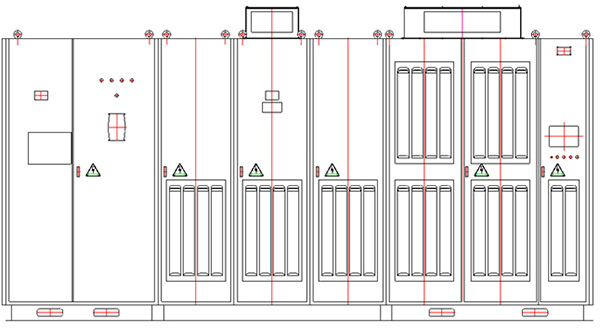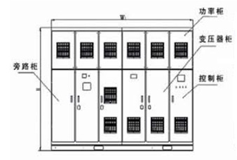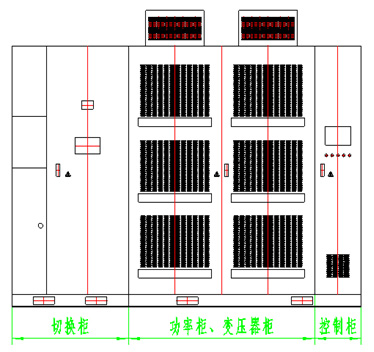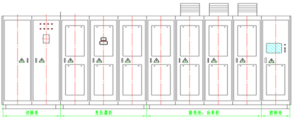 設計之初,為保證產(chǎn)品的可靠性、穩定性,采用雙重冗余設計的模式,即加大了單元的數量,也增大了各器件的選型。10kV采用每相10個(gè)單元或13個(gè)單元,6kV采用每相6個(gè)單元或8個(gè)單元;功率器件選型余量大至2.5倍甚至3倍,電解電容選擇90-120UF/A,變壓器鐵芯、風(fēng)機風(fēng)量選型都不同程度的大一規格。其排布則延續傳統的排布模式,即從左往右依次為切換柜、變壓器柜、(接線(xiàn)柜)、功率柜、控制柜的模式,其外形如圖(1):