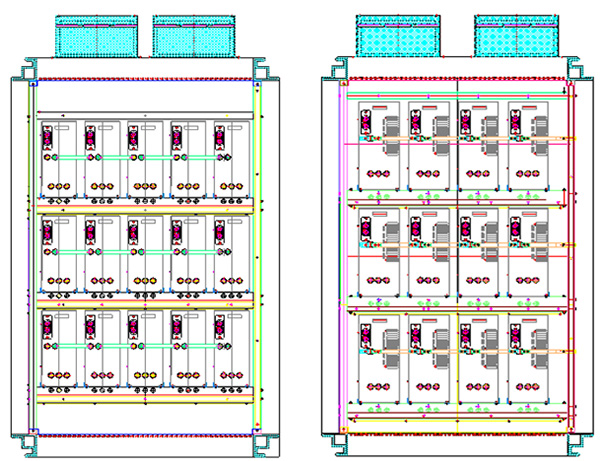 隨著(zhù)高壓變頻器市場(chǎng)規模的不斷擴大,用戶(hù)對變頻的苛求也越來(lái)越嚴格。作為產(chǎn)品開(kāi)發(fā)商,也不斷為提升產(chǎn)品質(zhì)量與檔次作著(zhù)不懈努力,所用柜體也由原來(lái)的單一種類(lèi)向更寬范方向發(fā)展,其產(chǎn)品功能、質(zhì)量與外形都在不斷升級。同規格變頻器原體積如圖(4)。其單元結構排布也有了更新的認知,由于原來(lái)每相豎排所用電纜多、結構復雜、附加成本大,便改為每相單元橫排,使變壓器次級引線(xiàn)分別對應A、B、C三相,不再有接線(xiàn)柜,直接通過(guò)電纜托板到達各單元,不再迂回,其控制柜也由原來(lái)的600mm轉為400mm。另一個(gè)飛躍則是每相單元數量的減少,如10kV改為8單元/相,6kV改為5單元/相。功率單元數量少了,其整機質(zhì)量并沒(méi)有受到影響,相反其故障點(diǎn)卻相應減少,加之電路結構上星點(diǎn)漂移技術(shù)的應用,使得變頻器性能更加優(yōu)越。功率柜具體排布情況,6kV5個(gè)單元,每相橫向分布,上、中、下三相如圖(5)所示。10kV如果采取單元前后放置,每相前4后4,如圖(6)所示: