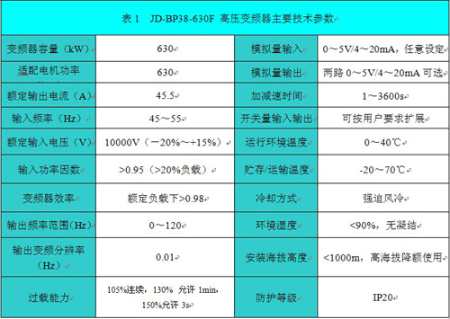 JD-BP38-630F高壓變頻器技術(shù)參數如表1所示。