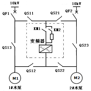 /10kV電機)高壓變頻器,高壓變頻器采用“一拖二”手動(dòng)旁路方案。1#、2#水泵一次系統接線(xiàn)圖路如圖2所示,通過(guò)切換高壓隔離開(kāi)關(guān)把高壓變頻器切換到要運行的水泵上去。高壓變頻器可以拖動(dòng)1#供水泵電動(dòng)機實(shí)現變頻運行,也可以通過(guò)切換拖動(dòng)2#供水泵電動(dòng)機實(shí)現變頻運行。兩側供水泵電動(dòng)機均具備工頻旁路功能。