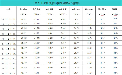 在上位機監控系統具有豐富的功能。除了可以具有以下功能:變頻啟動(dòng)、變頻停止、故障復位外,還可以顯示變頻運行指示、變頻停止指示、故障輸出、通訊指示等,并可在上位機上實(shí)時(shí)顯示變頻器的運行數據、設定壓力、反饋壓力和當前狀態(tài)。上位機變頻器實(shí)時(shí)監控運行數據如表3所示。