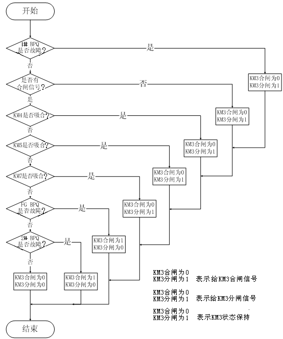 KM8的控制邏輯與KM7類(lèi)似,只是吸合條件判斷變?yōu)榕袛郖M7是否吸合。
