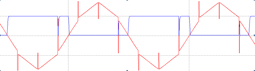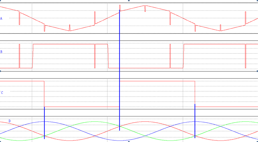 在這個(gè)電路中通過(guò)光耦TA、TB、TC的次級就可以獲取三相的過(guò)零信號,但在反向整流工作中仍然由于電源缺口在光耦次級會(huì )有比較窄的過(guò)零脈沖,但是完全可以通過(guò)CPLD適當的處理去掉,如圖3中的藍色,沒(méi)有經(jīng)過(guò)CPLD處理時(shí)獲取的信號: