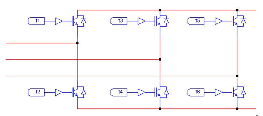 圖中t1\t2對應A相,t3\t4對應B相,t5\t6對應C相,假設信號a\b\c進(jìn)行濾波延時(shí)處理后的信號為A\B\C,則6個(gè)驅動(dòng)信號的邏輯處理為: