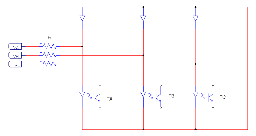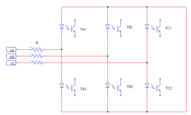 由于反向整流要求同步信號有比較高的對稱(chēng)波形,上面的電路中只是取到了相電壓的大于零的部分,但由于光耦和二極管的壓降存在,可能會(huì )使得不對稱(chēng)的情況產(chǎn)生,所以如果要正負半周對稱(chēng),可以考慮使用6個(gè)光耦來(lái)產(chǎn)生信號,如下圖: