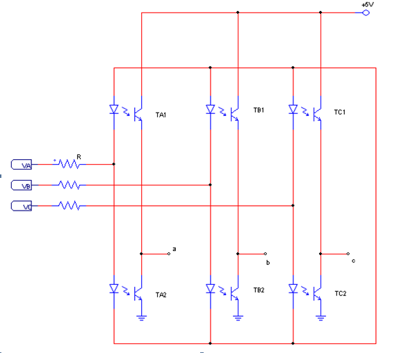 對于上述情況考慮采用光耦來(lái)獲取同步信號的過(guò)零點(diǎn),這樣就可以不用考慮三相中點(diǎn)電位問(wèn)題,又能夠獲取相電壓的過(guò)零點(diǎn),初步方式如圖2所示: