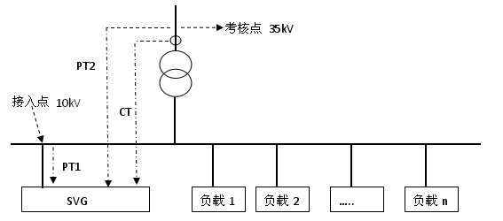 現場(chǎng)采用降壓式接入方式,10kVSVG通過(guò)變壓器接入35kV電網(wǎng),考核點(diǎn)在35kV側,SVG通過(guò)并網(wǎng)變壓器接入電網(wǎng),變壓器接入點(diǎn)與考核點(diǎn)相同。如圖3所示。PT信號連接到PT1,并且二次接線(xiàn)端子PTA1與接入點(diǎn)電網(wǎng)一次端 子A必須是同一相;PTB1與接入點(diǎn)電網(wǎng)一次端子B必須是同一相,PTC1與接入點(diǎn)電網(wǎng)一次端子C必須是同一相。PT1用于SVG計算并網(wǎng)同步信號,還用于計算考核點(diǎn)處的無(wú)功。
