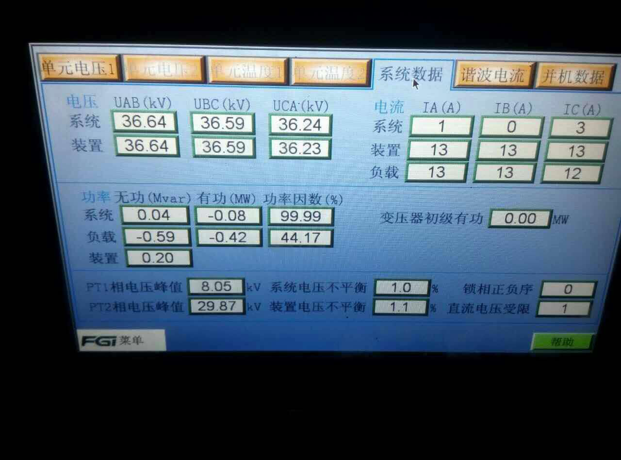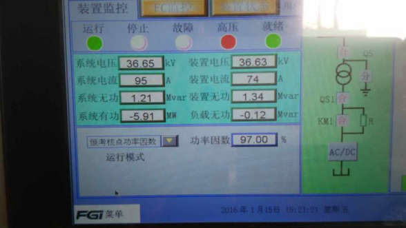 617-2011要求“大中型光伏電站應配置無(wú)功電壓控制系統,具備無(wú)功功率及電壓控制能力。根據電力調度部門(mén)指令,光伏電站自動(dòng)調節器發(fā)出(或吸收)無(wú)功功率,控制光伏電站并網(wǎng)點(diǎn)電壓在正常運行范圍內,其調節速度和控制精度應能滿(mǎn)足電力系統電壓調節的要求。低電壓穿越過(guò)程中光伏電站宜提供動(dòng)態(tài)無(wú)功支持?!薄禛B/T29321-2012光伏發(fā)電站無(wú)功補償技術(shù)規范》中5.2條款要求,“光伏電站無(wú)功補償裝置應能夠跟蹤光伏電站處理的波動(dòng)及系統電壓控制要求,并快速響應。動(dòng)態(tài)無(wú)功響應時(shí)間應不大于30ms?!痹摴夥娬緲I(yè)主通過(guò)招標方式,選擇了新風(fēng)光生產(chǎn)的FGSVG-3.0/35T-O型高壓動(dòng)態(tài)無(wú)功補償和諧波治理裝置,配置在光伏發(fā)電現場(chǎng),用于電網(wǎng)無(wú)功補償和諧波治理,設備一次成功投運,達到了預期目的。