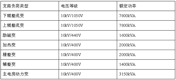 上輥整流變以及下輥整流變支路為軋機主動(dòng)力電機支路,主要提供軋機上下棍直流電機的供電,供電方式為12脈沖整流供電,上下棍咬鋼過(guò)程中瞬間功率迅速大幅度提高,同時(shí)12脈沖整流電路會(huì )產(chǎn)生11、13次諧波成分。輔整變和精整變支路為三相6脈沖整流電路,功率輸出過(guò)程產(chǎn)生部分5、7次諧波電流。整個(gè)生產(chǎn)過(guò)程各負荷支路協(xié)同運行,對于電網(wǎng)造成明顯的功率沖擊和諧波污染。