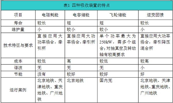 從較早的在牽引變電所設置再生能量電阻消耗裝置的應用到近幾年電容儲能、飛輪儲能技術(shù)、再生電能逆變回饋設備發(fā)展,再生制動(dòng)能量吸收技術(shù)在不斷研制和持續改進(jìn),在國內外軌道交通線(xiàn)路上得到應用。針對目前使用的四種吸收裝置方案,表1給出了四種吸收裝置的特點(diǎn):