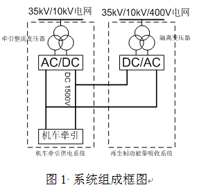 再生制動(dòng)能量吸收裝置是并聯(lián)在1500V/750V直流系統中,經(jīng)過(guò)逆變裝置變成交流,經(jīng)隔離變壓器輸入到電網(wǎng)(35kV/10kV/400V)。