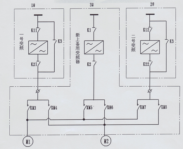 1#和2#是原來(lái)兩套變頻器系統,3#是新上備用變頻器。正常情況下KM3,KM8吸合,1#和2#變頻器分別驅動(dòng)兩臺電機。假如1#變頻器出現故障,KM3交流接觸器斷開(kāi),KM5吸合。3#變頻器以飛車(chē)啟動(dòng)模式把電機帶起來(lái),不影響生產(chǎn)。假如2#變頻器出現故障,KM8交流接觸器斷開(kāi),KM6吸合,3#變頻器以飛車(chē)啟動(dòng)模式把電機帶起來(lái)。把故障變頻器維修好后,給3#備用變頻器切換信號,3#變頻器輸出交流接觸器KM5或KM6斷開(kāi),原來(lái)對應的接觸器吸合,維修后的變頻器以飛車(chē)形式啟動(dòng)。同樣,如果開(kāi)始投入的是2#和3#變頻器,其中的一臺出現故障,也可以切換到1#變頻器上。實(shí)現了1#,2#、3#三臺變頻器之間的任意切換。