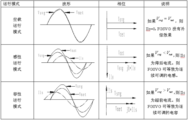 在交流電路中,電壓和電流的相位有三種情況,當負載是純電阻特性時(shí),電壓和電流相位相同;當負載是(或含有)電感特性時(shí),電壓相位超前電流相位;當負載是(或含有)容性特性時(shí),電壓相位滯后電流相位。如圖3所示,基本原理就是將自換相橋式電路通過(guò)變壓器或者電抗器并聯(lián)在電網(wǎng)上,適當地調節橋式電路交流側輸出電壓的幅值和相位,或者直接控制其交流側電流就可以使該電路吸收或者發(fā)出滿(mǎn)足要求的無(wú)功電流,實(shí)現動(dòng)態(tài)無(wú)功補償的目的,如表2所示。